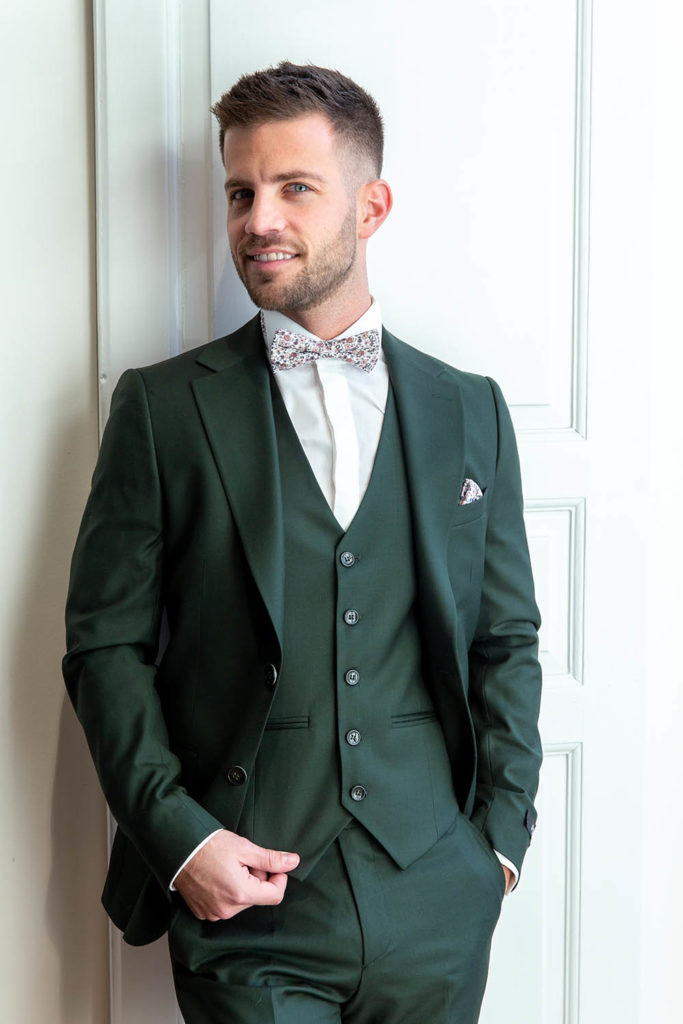 Une merveilleuse couleur qui a fait son entrée chez Mcostumes , le vert foncé Le vert foncé est très lumineux pour l’été avec une chemise ivoire au prix de 59€ Vous pouvez aussi l’assortir avec un gilet et nœud fleuri L’ensemble 3 pièce est au prix de 299€