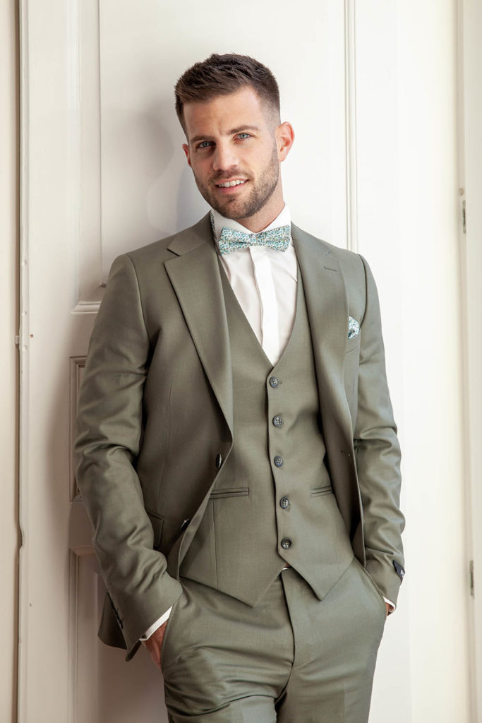 Magnifique ensemble 3 pièces Kaky qui est vendu au prix de 229€ Une couleur très tendance pour cet été qui va dans tout les styles de votre mariage Vous pouvez le porter avec des baskets blanches Il est porté avec une chemise ivoire au prix de 59€